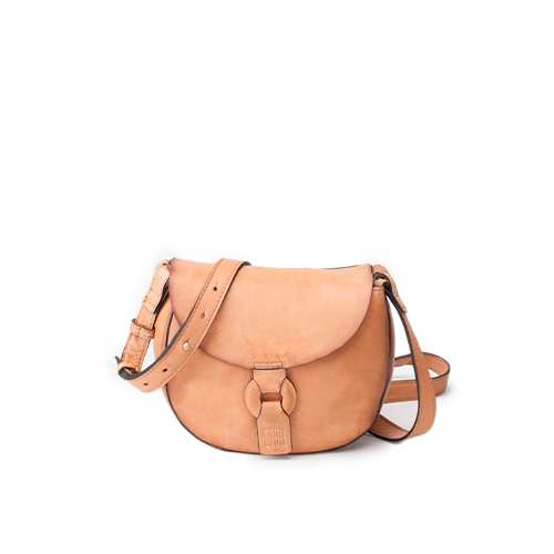 Características: Bolso bandolera de piel vacuna lavada, y de curtición vegetal. Los bordes del bolso están oscurecidos, creando un efecto de profundidad. Cierre con solapa e imán, bandolera regulable y bolsillo interno.