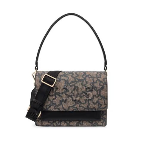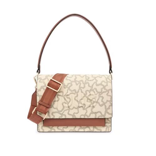 El Bolso bandolera mediano Audree TOUS Kaos Icon de lona con estampado Kaos en color beige y gris con detalles de piel sintética. Bolso con dos compartimentos separados por un bolsillo con cierre de cremallera y un bolsillo abierto en la parte delantera. Cierre de solapa con dos botones magnéticos. Asa de hombro fija y asa bandolera ajustable y extraíble.