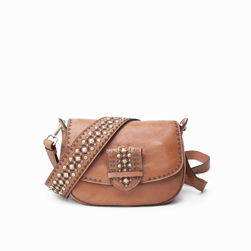 El Bolso Biba piel Cody cuero es de piel lavada. Complejo trabajo manual de tachuelas y corte laser en la solapa y asa de hombro, siendo esta ultima extraible. Cierre con cremallera, bandolera ajustable y extraible, bolsillos externos e internos, y forro de algodon.