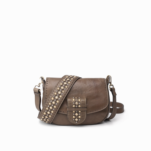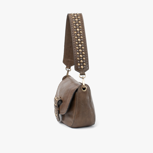El Bolso Biba piel Cody verde es de piel lavada. Complejo trabajo manual de tachuelas y corte laser en la solapa y asa de hombro, siendo esta ultima extraible. Cierre con cremallera, bandolera ajustable y extraible, bolsillos externos e internos, y forro de algodon.